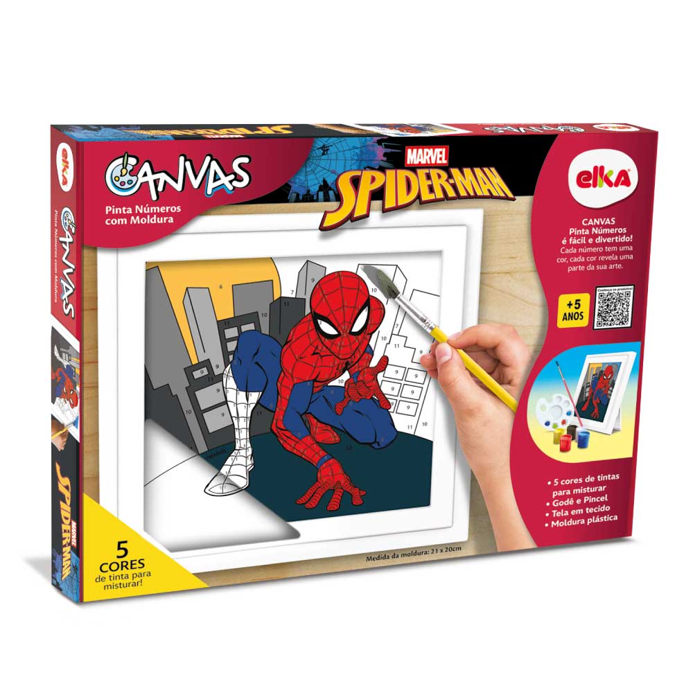 CANVAS Pinta Números estimula a criatividade da criançada. Tela em tecido tipo canvas com imagem do seu personagem favorito, onde cada número tem uma cor e cada cor pintada revela uma parte da sua arte. A moldura plástica serve como suporte para pintar e depois transforma a tela em um quadrinho para decorar como quiser. Vem com 5 tintas e pincel.