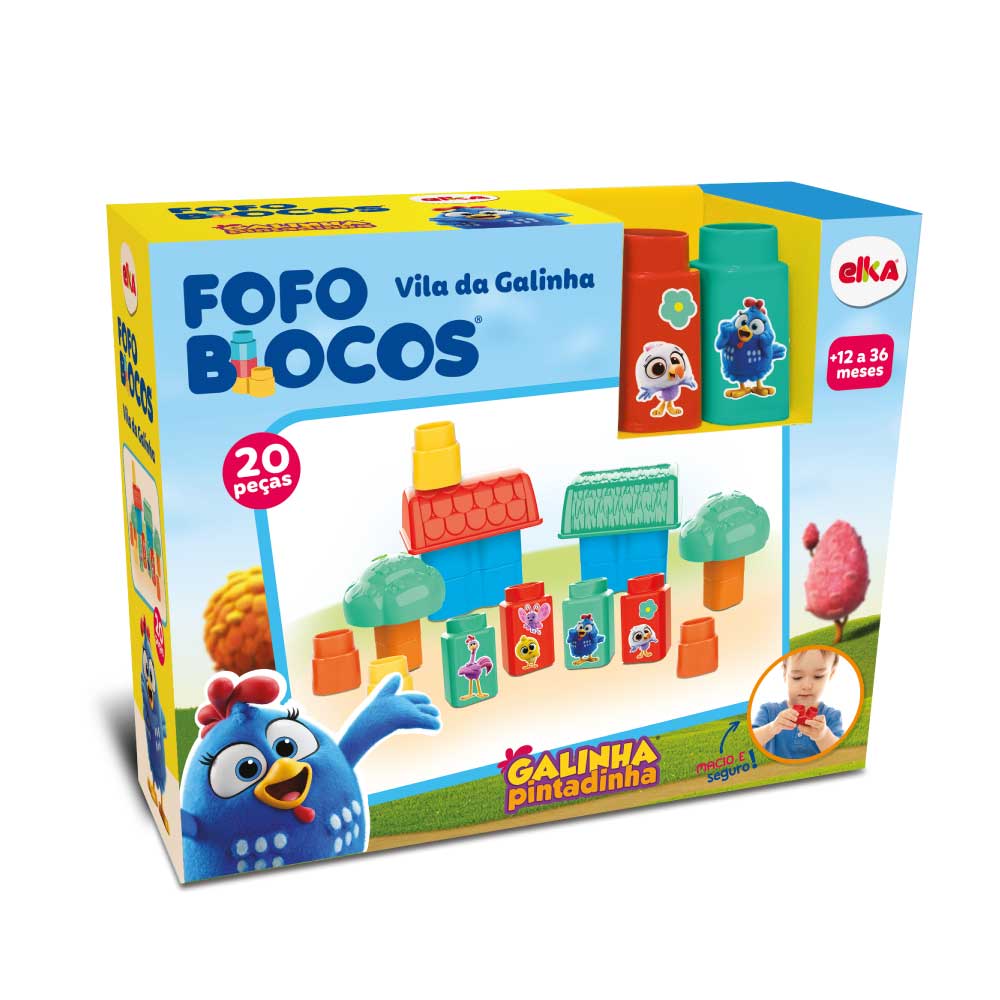 Conjunto de blocos fofos formando um playset divertido viver muitas aventuras na Vila da Galinha Pintadinha. Desenvolve a coordenação motora e os sentidos dos pequenos de forma lúdica e segura. Material Atóxico.